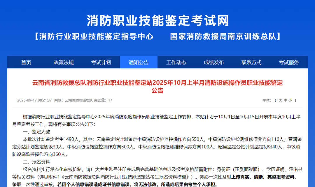 云南省消防救援总队消防行业职业技能鉴定站2025年10月上半月消防设施操作员职业技能鉴定公告
